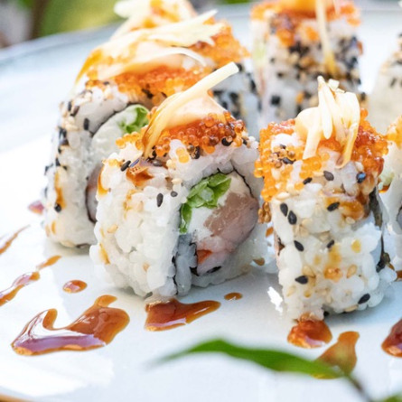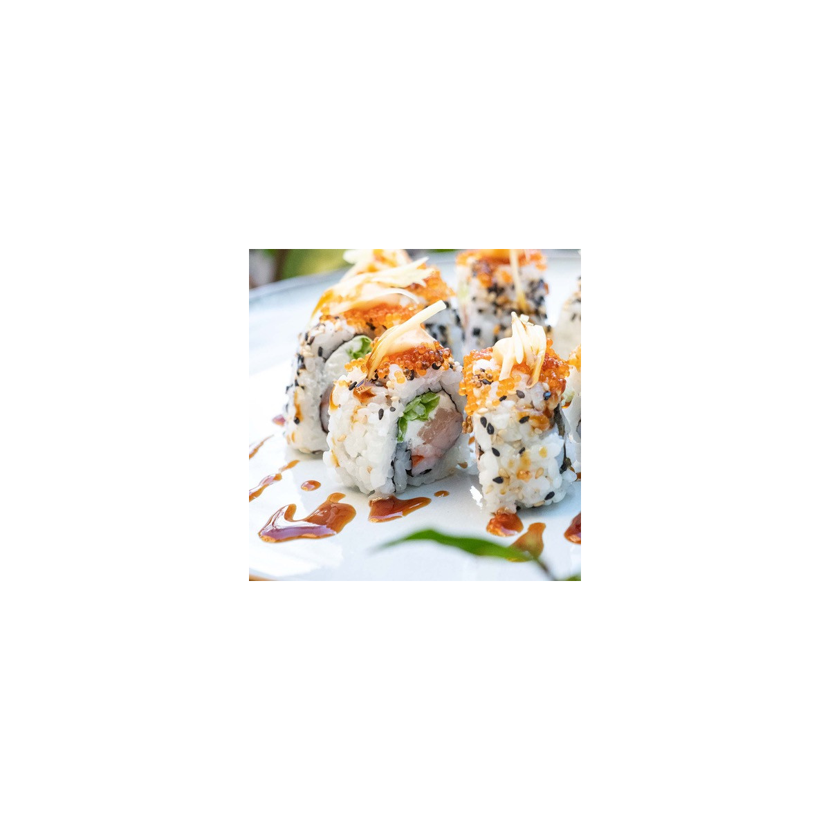 Con all'interno gambero, branzino, insalata, philadelphia e maionese. All'esterno: tobiko orange, salsa teriyaki, salsa spicy e julienne di mango.